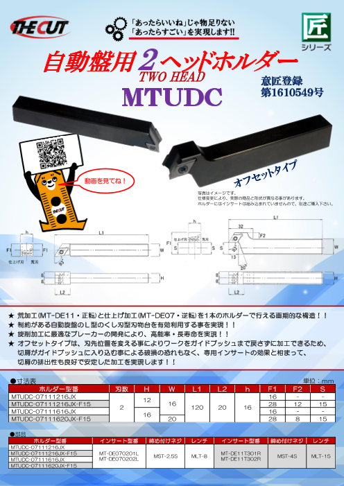 『MTUDC』自動盤用2ヘッドホルダーは、荒加工(MT-DE11・正転)と仕上げ加工(MT-DE07・逆転)を、 1本で行える画期的な構造のバイトホルダーです。 旋削加工に好適なチップブレーカーの開発により、高能率・長寿命を実現。 オフセッ...