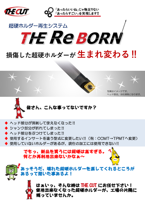 超硬ホルダー再生システム 【THE Re BORN】 損傷した超硬ホルダーが 生まれ変わります。 ※詳しくはPDF資料をご覧いただくか、お気軽にお問い合わせ下さい。