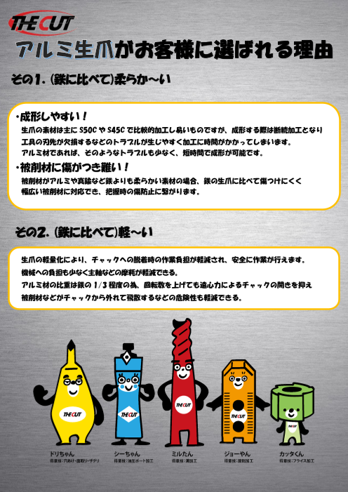 【特長】 ■アルミ製生爪は鉄鋼製生爪に比べ軟らかく、ワークにキズが付きにくい。 ■鉄鋼製生爪に比べ比重が小さいので、遠心力による把握力の定価を抑えることができ、 高回転域での使用が可能。 ■軟らかく切削性が良いため、生爪の成形が容易。