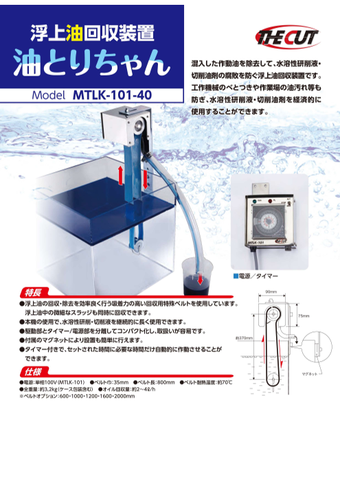 『油(ゆ)とりちゃん』は、混入した作動油を除去して、水溶性研削液・切削油剤の腐敗を防ぐ浮上油回収装置です。 工作機械のべとつきや作業場の油汚れ等も防ぎ、水溶性研削液・切削油剤を経済的に使用することができます。 浮上油の回収・除去を効率良く行う吸着力の...