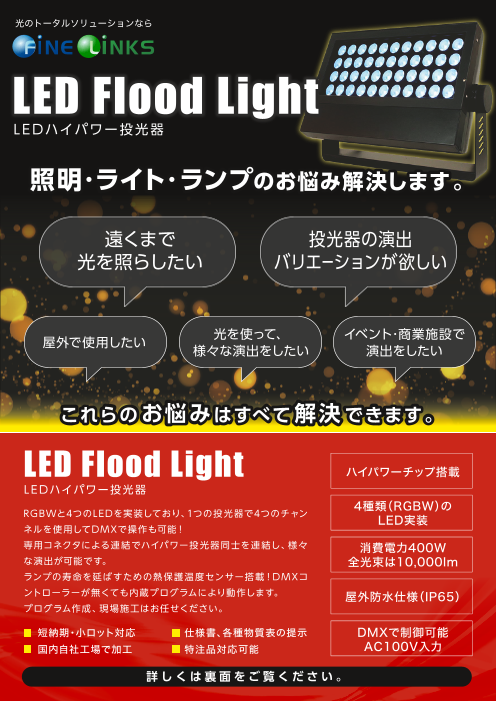 オープンスペース等の大きな演出向け 3つのパネルを個別に制御可能。 屋外使用にも対応した、ハイパワー投光器 ◆詳細はカタログをダウンロードしご覧いただくか、お気軽にお問い合わせ下さい。