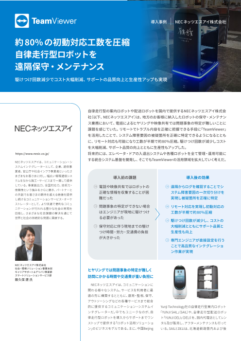 自律走行型の案内ロボットや配送ロボットを国内で提供するNECネッツエスアイ株式会社(以下、NECネッツエスアイ)は、地方のお客様に納入したロボットの保守・メンテナンス業務において、電話によるヒヤリングや映像共有では問題事象の特定が難しいことに課題を感じて...