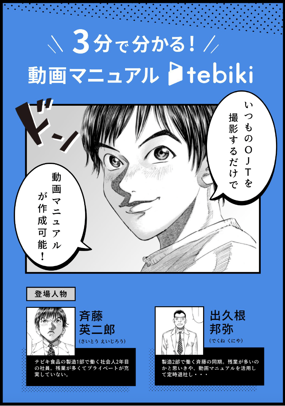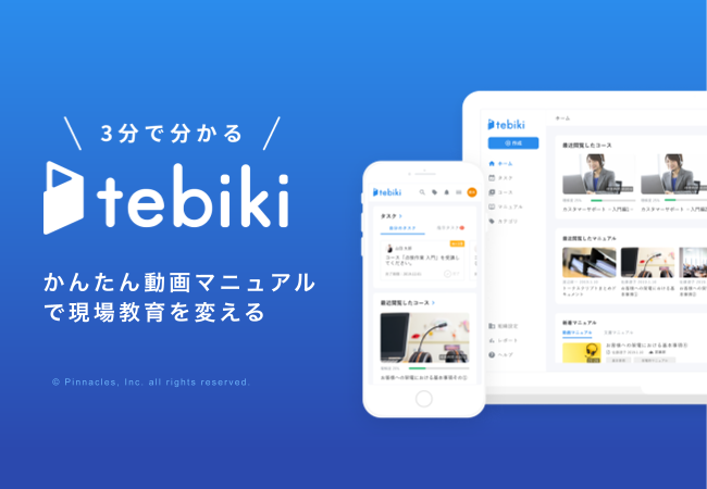 いつものOJTを撮影するだけで動画マニュアルが作成可能 ・現場の教育を、動画でもっとかんたんに ・紙のマニュアルや教科書は、大事な動きやニュアンスが伝わらないから、せっかく作ってもほとんどの現場で活用されていません。 ・tebikiは圧倒的にか...