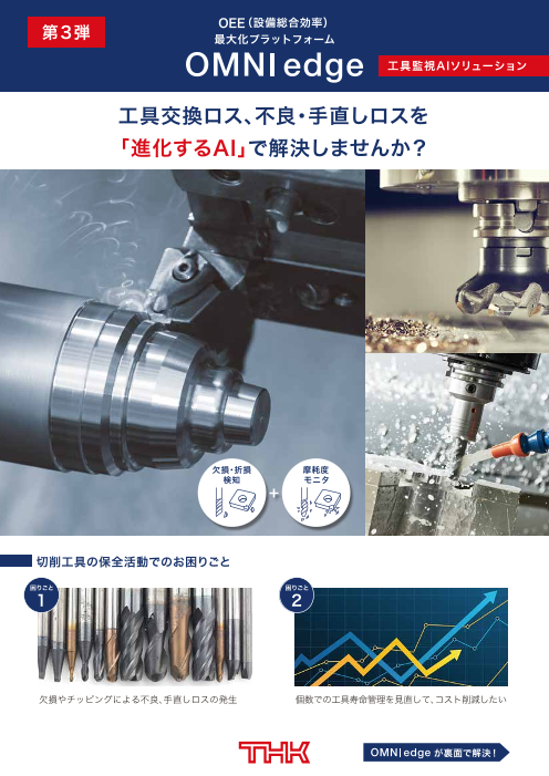 工具監視AIソリューションはTHKが提供しているIoTサービス「OMNIedge」のソリューションです。 ■切削工具工具のお困りごとを解決 「工具寿命を見直してコスト削減したい」 「欠損やチッピングによる不良、手直しロスの発生」 ■特長 ...