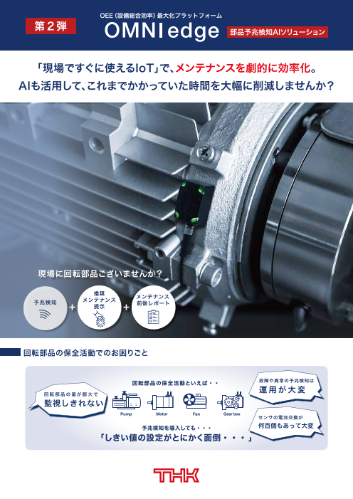 回転部品において、以下のようなお悩みをよくお聞きします。 ・故障や異常の予光検知は運用が大変 ・センサの電池交換が何百個もあって大変 ・回転部品の量が膨大で監視しきれない ・予兆検知を導入しても「しきい値の設定がとにかく面倒・・・」 THK...