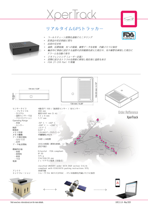 ◆医薬品の安定供給に寄与 ◆出荷の完全性 ◆温度,位置情報,光への暴露,衝撃データを収集・内蔵メモリに保存 ◆輸送中に事前に設定する温度の許容範囲を超えた場合や、光や衝撃を検知した場合にアラームを自動で発令 ◆ジオフェンシング(ユーザー定義) ...