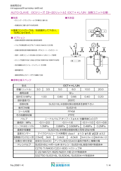 【OCシリーズ】『OCT/UN』は静置式オートクレーブユニットです。Oリング&クランプによるシール方式です。 耐薬品性に優れるFFKMを採用し、クランプシールで作業性に優れます。 ■容量は100ミリリットルから2リットルまで標準対応しています。 設...