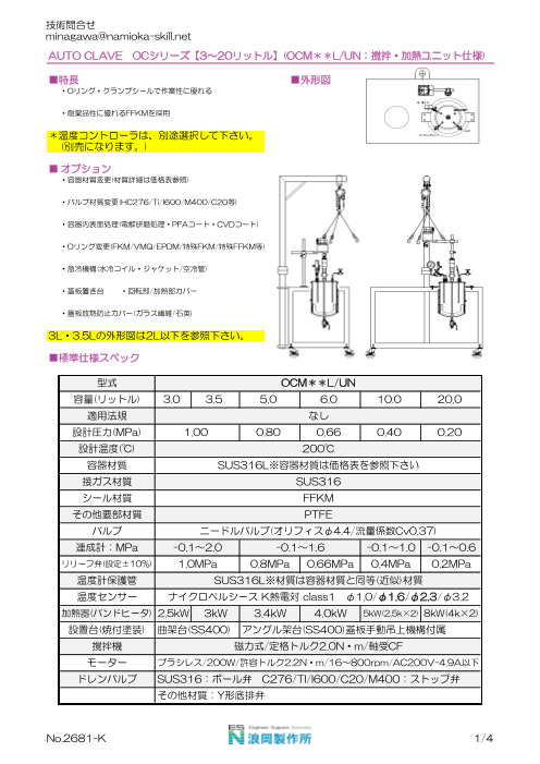 【OCシリーズ】『OCT』はオートクレーブ(反応器)です。Oリング&クランプによるシール方式です。 耐薬品性に優れるFFKMを採用し、クランプシールで作業性に優れます。 ■容量は100ミリリットルから2リットルまで標準対応しています。 設計容量は1...