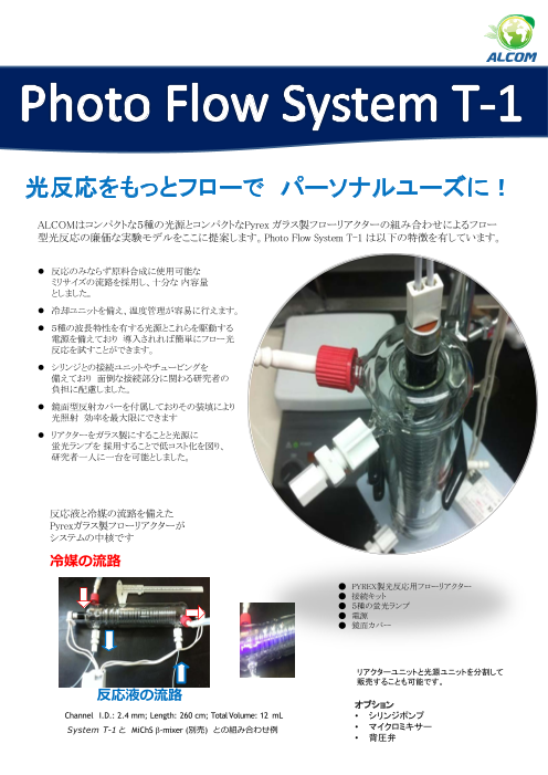 『Photo Flow System T-1』は、5種の波長特性を有する光源とこれらを 駆動する電源を備えており、導入されれば簡単にフロー光反応を試すことができます。 反応のみならず原料合成に使用可能なミリサイズの流路を採用。リアクターを ガラ...