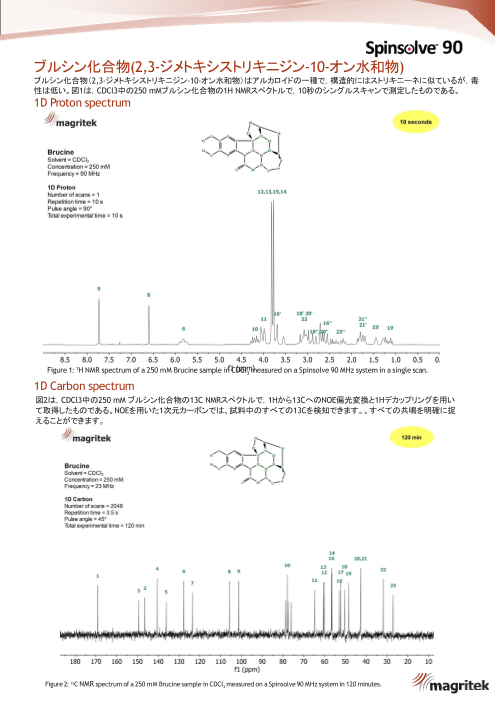 ブルシン(2,3-ジメトキシストリキニジン-10-オン)はアルカロイドの一種で、構造的にはストリキニーネと似ていますが、毒性は低い化合物です。この化合物を90MHzにて測定した結果をカタログに収録しております。