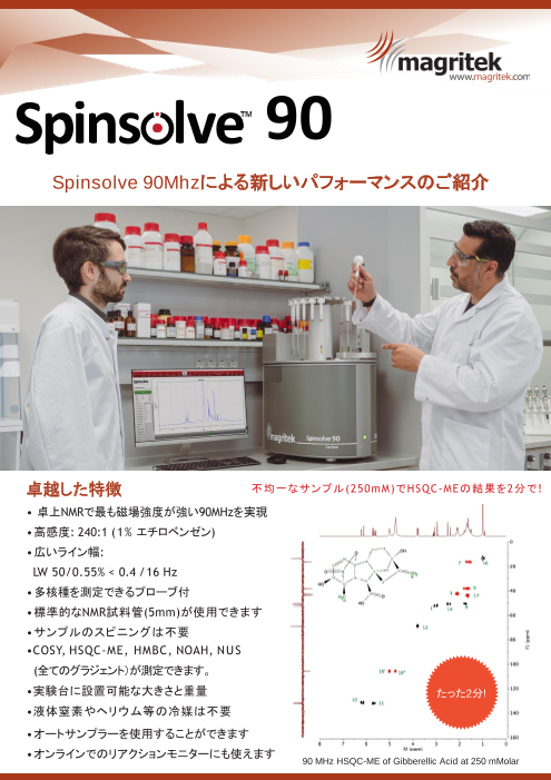 Spinsolveは革新的な卓上サイズのNMRで、コンパクト低コストでありながら、利便性に優れ並外れた性能を兼ね備えています。さらにSpinsolveの制御ソフトウェアは誰でも簡単に操作できるようデザインされ、化学教育・合成化学者・反応追跡・産業における...