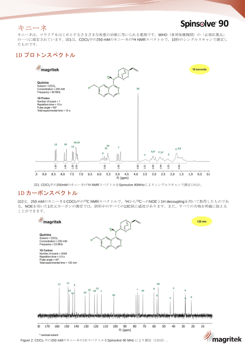 キニーネは、マラリアをはじめとするさまざまな疾患の治療に用いられる薬剤です。WHO(世界保健機関)の「必須医薬品」の一つに指定されています。このカタログでは90MHzで測定した結果を掲載しております。