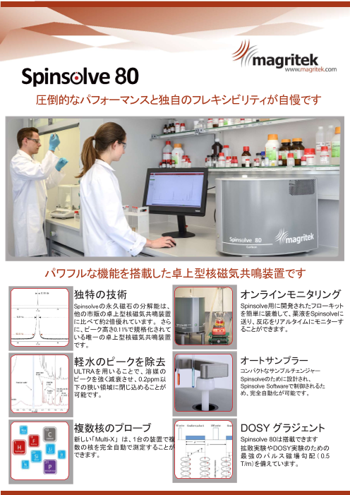 2D測定、3D測定を80MHzで測定できます!またリアクションモニターリングもより精度アップして測定できます! 『Spinsolve 80』は、80MHzの磁場強度を実現した 卓上型NMRです。 優れた化学シフト分解能と感度、高い解像度(0.5...