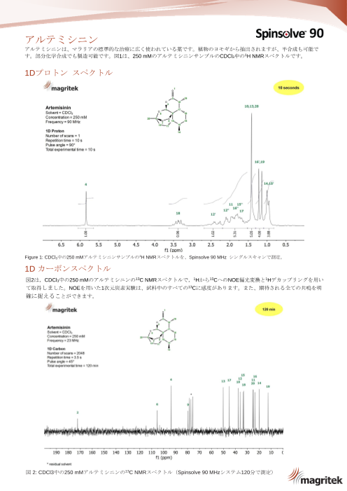 アルテミシニンは、マラリアの標準的な治療に広く使われている薬です。植物のヨモギから抽出されますが、半合成も可能です。部分化学合成でも製造可能です。このカタログではアルテミシニンを90MHzで測定した結果を掲載しております。
