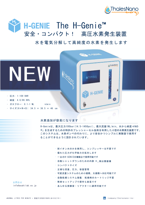 『H-Genie』は、最大圧力100bar(14.5-1450psi)、 最大流量1NL/minの水から純度4NのH2を生成する小型の水素発生装置です。 脱イオン水のみを使用し、コンプレッサーは不要です。 優れた圧力が化学能力を拡充。一台のH-...