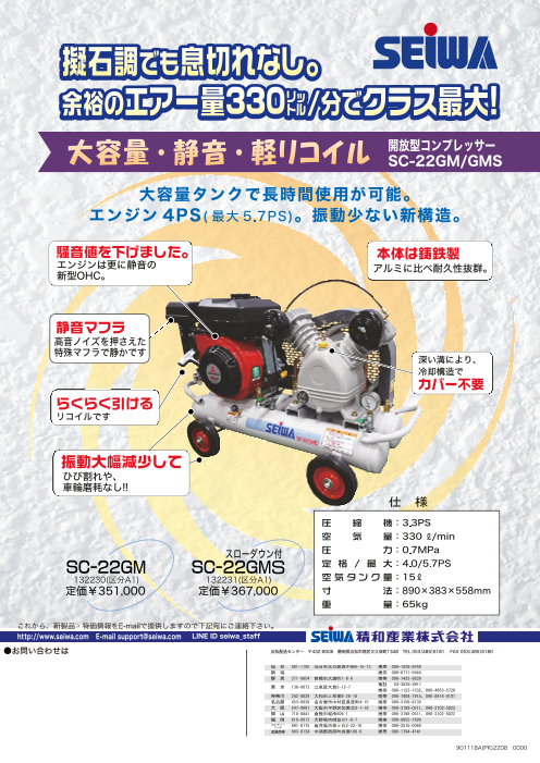 ◆シリンダーが丈夫な鋼材なので金属が摩耗し難くオイル汚れが少ない ◆静音マフラーで騒音を抑えるガソリンエンジンタイプ ◆らくらく引けるリコイル ◆余裕のエアー量330L/分(従来比10%UP) ◆深溝フィンなどの冷却構造で温度上昇を抑える ◆振...