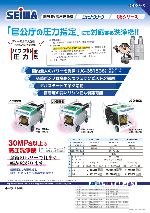 『官公庁の圧力指定』にも 対応する洗浄機!! ◆国内最大のパワーを発揮 ◇搭載ポンプは高耐久セラミックピストン採用 ◆セルスタートで楽々始動 ◇密着度の弱いリシン面も剥離可能