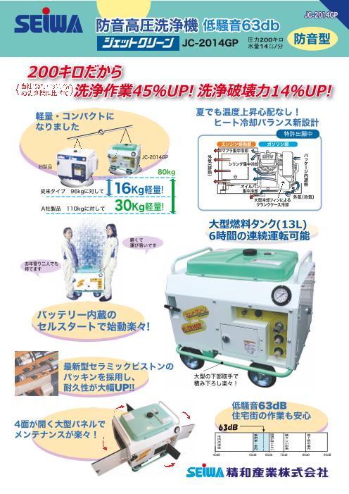 <特長> 防音高圧洗浄機 ★低騒音63dB ◆大型燃料タンク(13L)で6時間の連続運転可能 ◆バッテリー内蔵のセルスタートで始動楽々! ◆下部取っ手で積み降ろし楽々! ◆大型サイドドアでメンテナンスも容易! ◆低騒音63dBで住宅街の作...