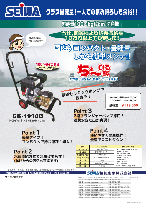 <特長> 国内初コンパクト・最軽量!しかも簡単メンテ ◆クラス最軽量!コンパクトで持ち運びも楽々! ◆水道直結方式で水桶要らず!(桶からの吸水も可能です) ◆3連プランジャーポンプ採用!連続安定吐出が実現! ◆使いやすく簡単操作!量産でコス...
