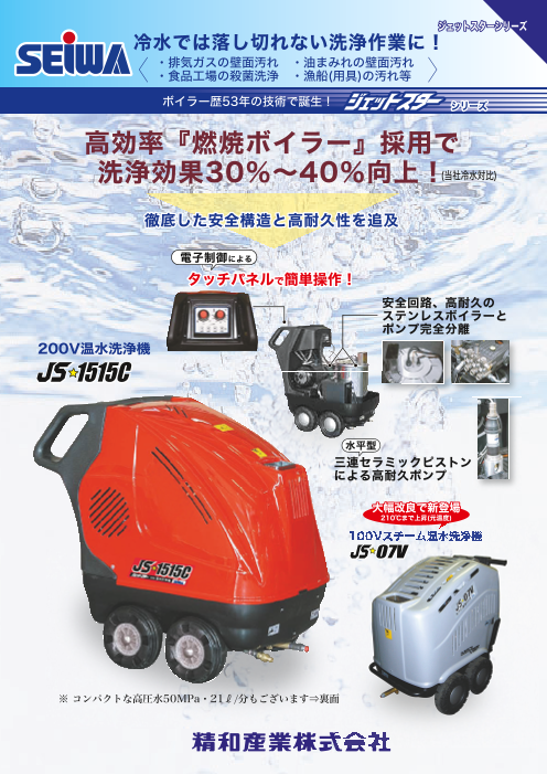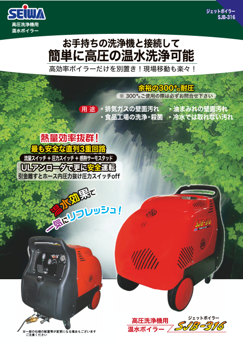 <特長> 高圧洗浄機用温水ボイラー ◆500キロ圧までの洗浄機対応 ◆圧力指定現場の温水洗浄に! ◆圧力+温水洗浄効果で冷水洗浄に対して約20%UP!