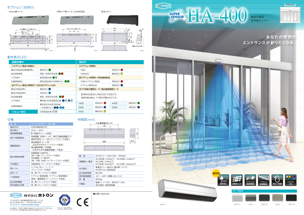 軽量ドアから大型商業施設・オフィスビルまで。 高い扉でも安定した高密度エリアを維持し、安全性を保ちつつ、開放感のある理想のエントランスを実現する自動ドアセンサーです。 無目取付型「HA-400」・無目内蔵型「HA-520」・無目下取付型「HA-430...