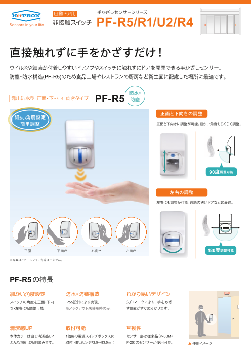 「手かざしセンサー」は手をかざすだけでドアを開閉できるので衛生的! 露出型/埋込型、正面・下・左右向きタイプなど、用途や使用場所によってお選びいただけます。 食品工場や医療施設、レストラン厨房出入り口など衛生面に配慮したい場所のウイルスや細菌...