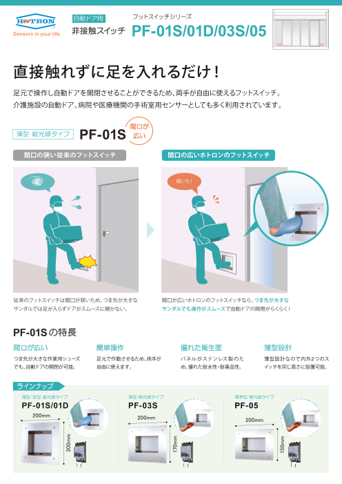 「フットスイッチ」は足元で操作し自動ドアを開閉させることができます。両手が自由に使えるため、食品加工工場、ホテルやレストランの調理室などで多く利用されています。 つま先が大きな作業用サンダルでも、開口の広い「PF-01S」や「PF-03S」なら自動...