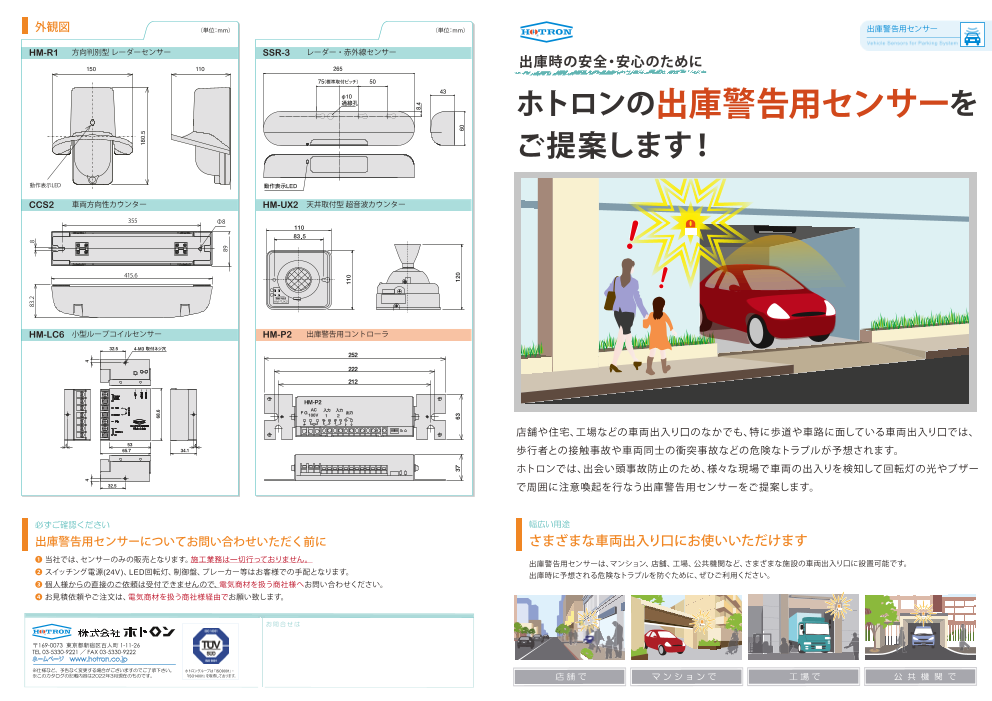 出会い頭事故防止のため、さまざまな現場の車両の出入りを検知して回転灯の光やブザーで周囲に注意喚起を行なうホトロンの出庫警告用センサーをご提案します。 店舗、マンション、工場、公共機関など、さまざまな施設の車両出入り口に設置可能です。後付け施工ができるの...