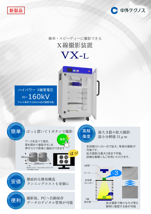 ワークを複数個並べて置き、扉を閉めて撮影ボタンを押すだけで簡単に撮影できます。 誰でも複雑な設定なく簡単にX線写真撮影を行うことが可能です。