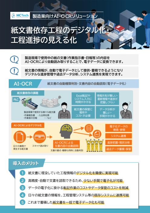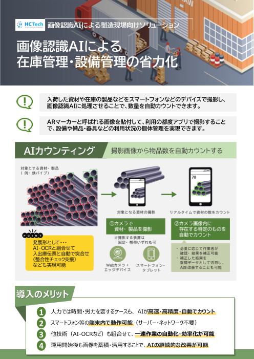 作業日報を書いたり、タブレット等の作業報告アプリで入力したり、など、現場の作業員の方にお願いして収集していた、工程ごとや製品ごとの作業実績情報について、AIを活用することで、自動的に収集することが可能となります。