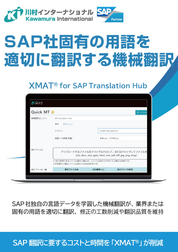 「XMAT® for SAP Translation Hub」とは、SAP社が⾃社製品のユーザー向けに開発した機械翻訳サービス「SAP Translation Hub」をブラウザ上で簡単に利用することができる機械翻訳活用プラットフォームです。 「SAP...