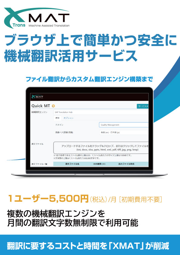 XMATは1ユーザー月額5,500円にて月間の翻訳文字数制限なしで、 「DeepL」や「みんなの自動翻訳」をご利用いただける完全定額制の機械翻訳クラウドサービスです。 機械翻訳を使う上で以下のような課題をお持ちではないでしょうか。 ・契約プ...