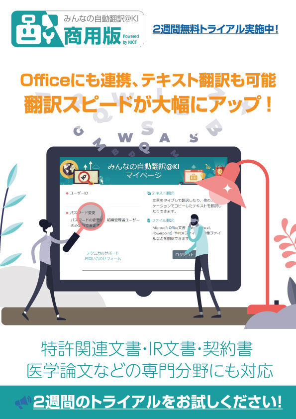 「みんなの自動翻訳@KI(商用版)」は、高いセキュリティ下で安心して機械翻訳を利用いただける高品質な国産のAI自動翻訳サービスです。「特許」や「法令契約」など個々のビジネス分野に特化した翻訳サービスが利用可能なため、ビジネスにふさわしい翻訳が可能です。 ...