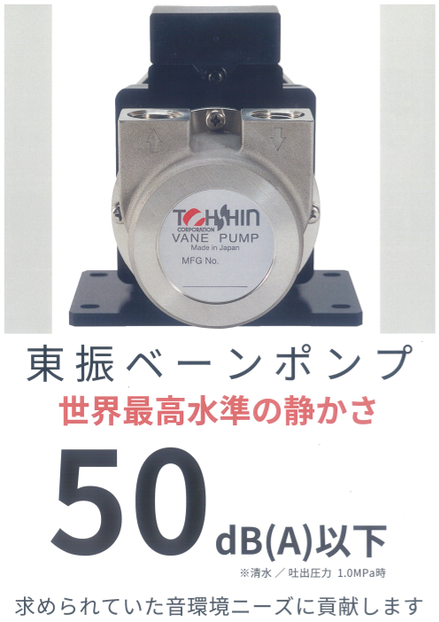 世界最高水準の静かさが さらに進化しました この静かさには価値がある 人にやさしい静かな環境づくりのためには、そこで使われるポンプが静かでなければなりません。 その価値を追い続けた東振ベーンポンプがさらに進化し、7dB(A)の低騒音化を実現しま...