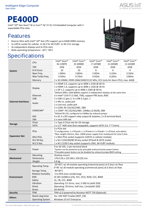 ASUS PE400Dは、過酷な環境下での使用を想定して設計された、強力な産業グレードのエッジサーバーです。インテル® 第10世代Core-iまたはXeon® プロセッサを搭載したPE400Dは、CFAST、デュアルM.2、mPCIe、トリプルPCIe、...
