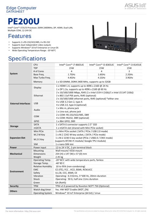 ASUS PE200UはAIoTコンピューティング向けの高品質でTCOに最適化されたソリューションを備えたインテリジェントエッジコンピューターです。PE200Uには最大6基のCOMポート(2 x RS-232/422/485)が含まれ、HDMI/DPと統...