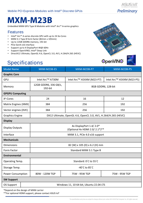 - Xe-Coreを6個搭載 インテル®Arc™ ディスクリートGPU - 標準MXM3.1タイプAフォームファクタ (82mmx70mm) - 4GB GDDR6メモリ、64ビット - PCIe Gen4x8インターフェイス - 最大4つのDi...