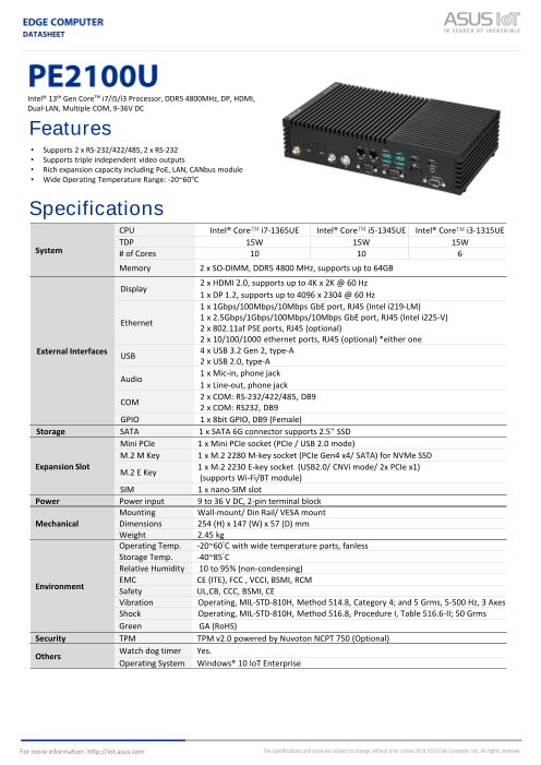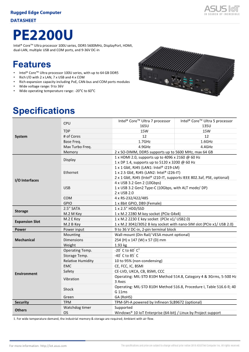 ASUS PE2100Uは、豊富なI/O機能、多様な接続オプション、ファンレス熱設計を特徴とし、多様なIoTアプリケーションに適したインテリジェントエッジコンピュータです。PE2100Uは、第13世代インテル®Core™-Iプロセッサを搭載し、最大4つの...