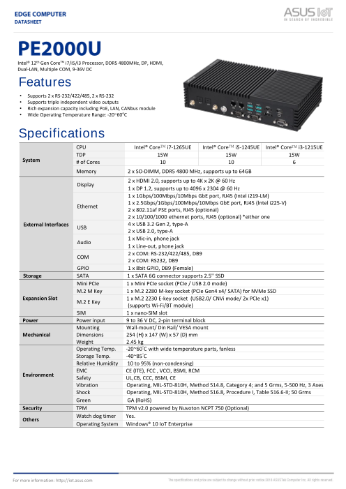 ASUS PE2000Uは、豊富なI/O機能、多様な接続オプション、ファンレス熱設計を特徴とし、多様なIoTアプリケーションに適したインテリジェントエッジコンピュータです。PE2000Uは、第12世代インテル®CoreTM-iプロセッサーを搭載し、最大4...