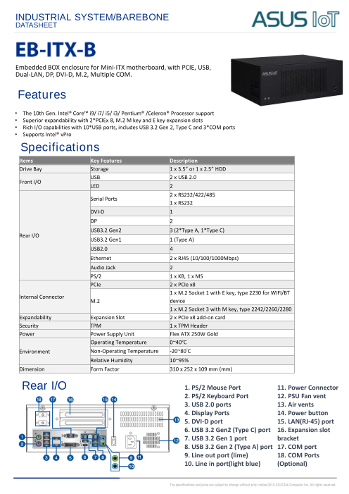 ASUS EB-ITX-Bは、コンパクトな筐体の標準Mini-ITX産業用マザーボードに対応するベアボーンシステムで、最大で第10世代インテル® Core™ i9プロセッサーとインテル® vProをサポートするQ470EI-IM-A R3.0を搭載します...