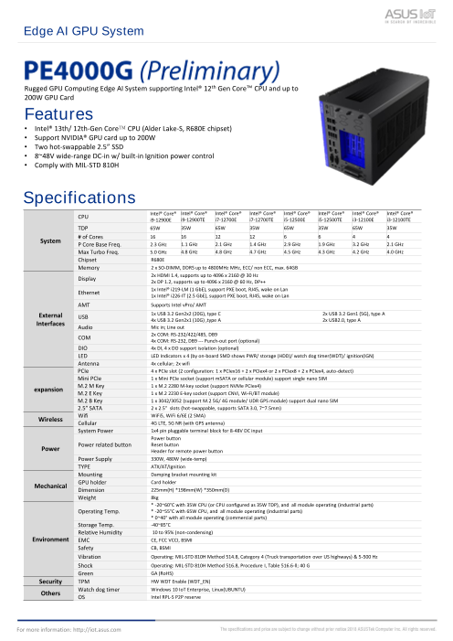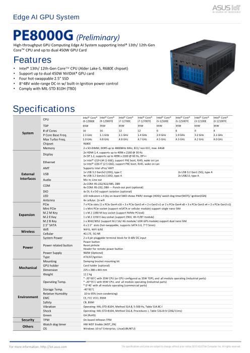 ASUS IoT PE8000Gは、第13/12世代インテル® Core™プロセッサを搭載し、エッジでのハイスループット、要求の厳しいGPUコンピューティングを強化します。業界をリードするテクノロジにより、PE8000Gはそれぞれ最大TDP450Wのデュ...
