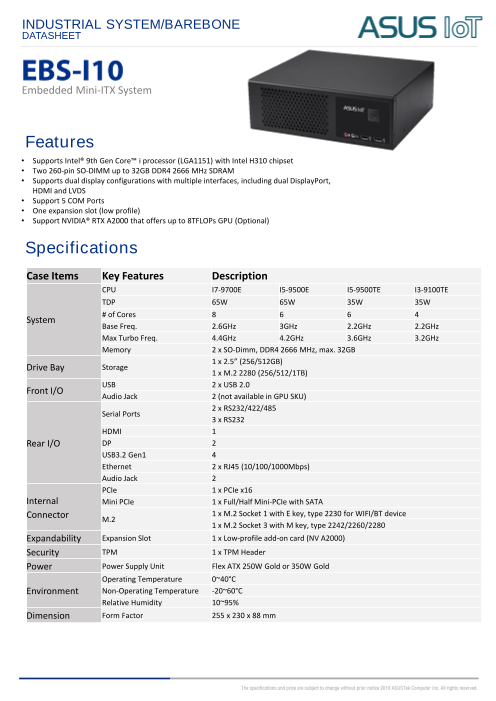 ASUS EBS-I10は、最大65Wのインテル® 第9世代Core™ i7プロセッサーに対応した高性能でコンパクトな組込みコンピュータです。Gigabit Ethernet × 2ソケット、USB × 6ポートなど、豊富なI/O接続を備えており、さまざ...