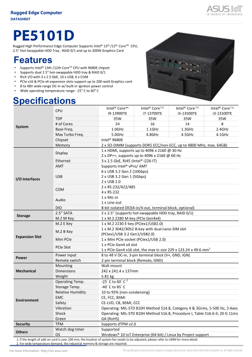 ASUS IoT PE5101Dは、インテル® R680Eチップセットを搭載し、最大24コア、32スレッドのインテル®第13および第12世代Core™プロセッサを搭載した堅牢な高性能エッジコンピュータで、最大4800MHzのDDR5に対応します。デュアル...