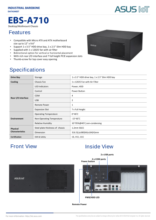 ASUS EBS-A710は、産業用およびAIoTコンピューティングアプリケーション向けに設計されたデスクトップ/ウォールマウントケースです。堅牢で耐久性に優れた1.2mm SGCCシートメタル製で、インテルQ470E、H610、Q670Eチップセットを...