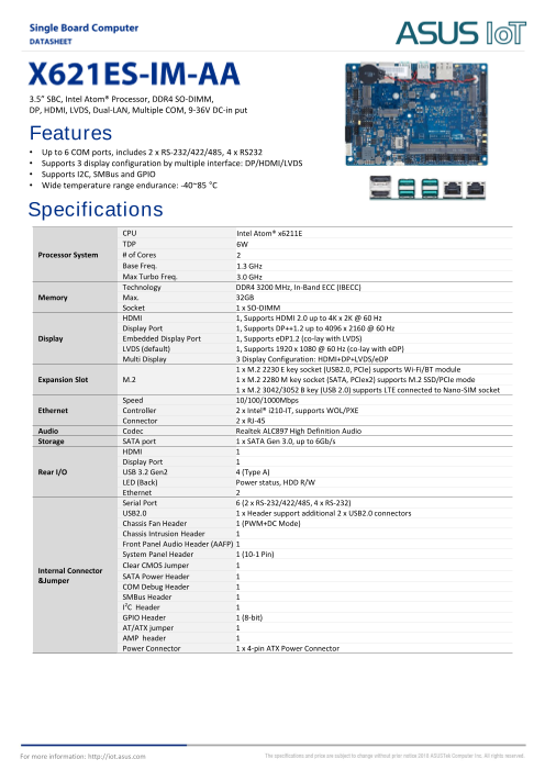 ASUS IoT X621ES-IM-AAは、豊富なI/O機能、高度なコネクティビティ、多彩なカスタマイズの可能性を備えた3.5型シングルボードコンピュータです。この小型ボードは、ケース の寸法を最小限に抑え、スペースに制約のある設置に適しています。複数...