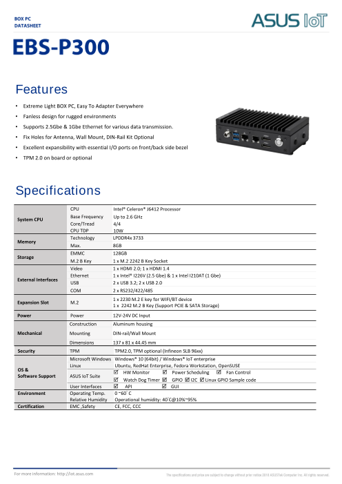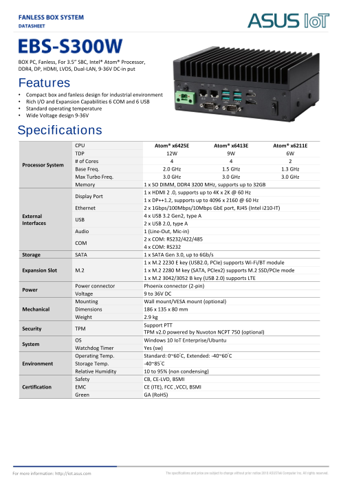 ASUS IoT EBS-S300Wは、インテル® Atom® x6000Eシリーズを搭載し、ファンレス熱ソリューションにより効率的な冷却を実現するよう設計されたファンレス組込みコンピュータです。AIoTアプリケーションに適した豊富なI/Oインターフェイ...