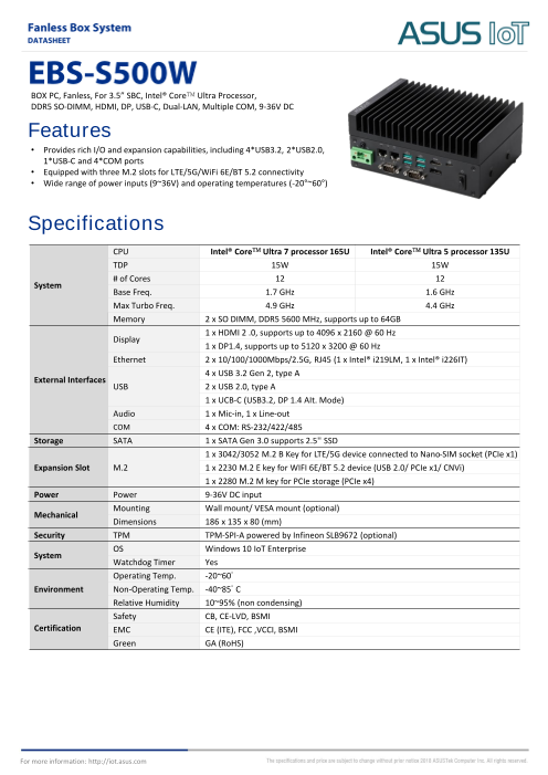 ASUS IoT EBS-S500Wは、Intel® Core™ Ultra プロセッサ100Uシリーズを搭載し、ファンレスの組み込みコンピュータです。ファンレスの熱解決策により、効率的な冷却を実現しています。豊富なI/Oインターフェースとさまざまな接続...