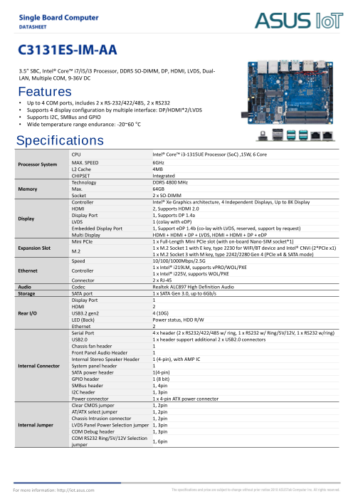 C3131ES-IM-AAは、小さな基盤に豊富なI/O機能、高度なコネクティビティ、柔軟なカスタマイズ・オプションを備えた3.5インチのシングルボードコンピュータです。小型のケースは限られたスペースでの設置に最適です。また、多彩なディスプレイ出力、産業用...