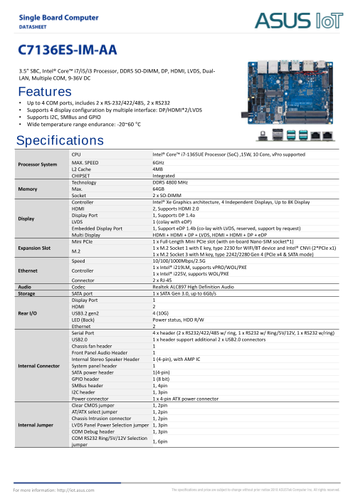 C7136ES-IM-AAは、小さな基盤に豊富なI/O機能、高度なコネクティビティ、柔軟なカスタマイズ・オプションを備えた3.5インチのシングルボードコンピュータです。小型のケースは限られたスペースでの設置に最適です。また、多彩なディスプレイ出力、産業用...