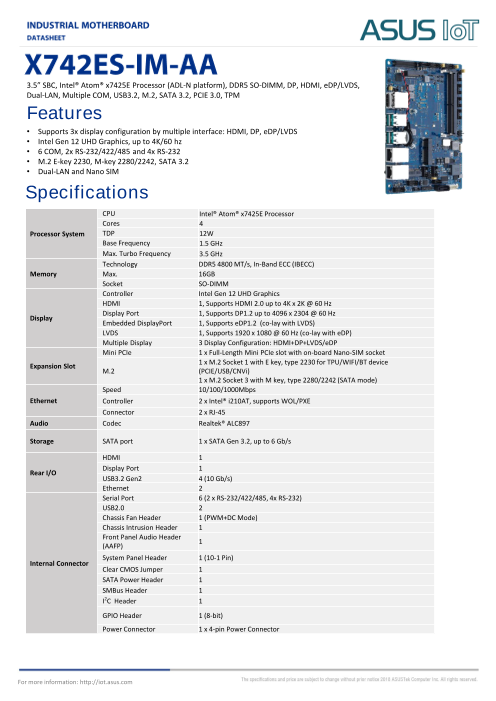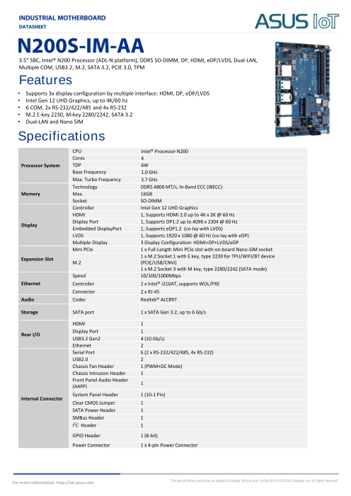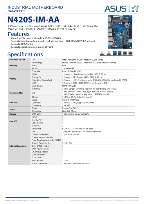 ASUS N420S-IM-AAは、小さな基盤に豊富なI/O機能、高度な接続性、柔軟なカスタマイズ・オプションを備えた3.5インチのSBC産業用マザーボードです。小型のケースは限られたスペースでの設置に最適です。最大6つのCOMポート(2 x RS-23...